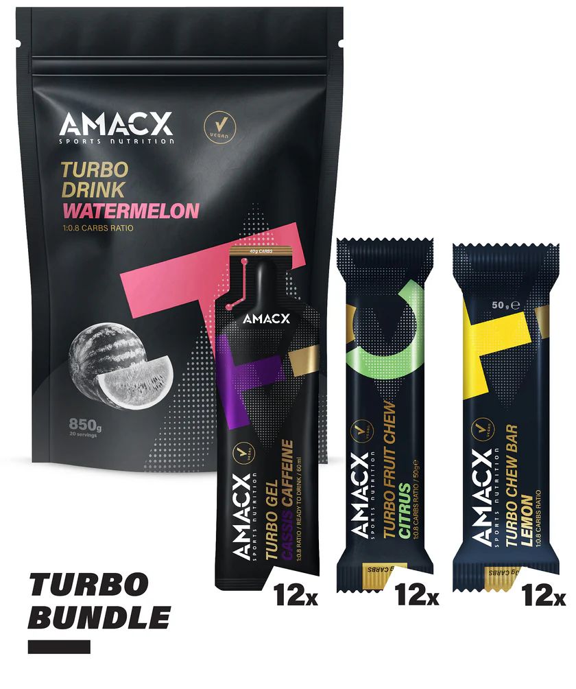El paquete Amacx Turbo Line es perfecto para momentos deportivos intensivos y duraderos. Los productos del paquete contienen una proporción uniforme de glucosa y fructosa de 1:0,8 y contienen carbohidratos. Con esta proporción (1:0,8) es posible conseguir una ingesta elevada de hidratos de carbono de hasta 120 gramos por hora.